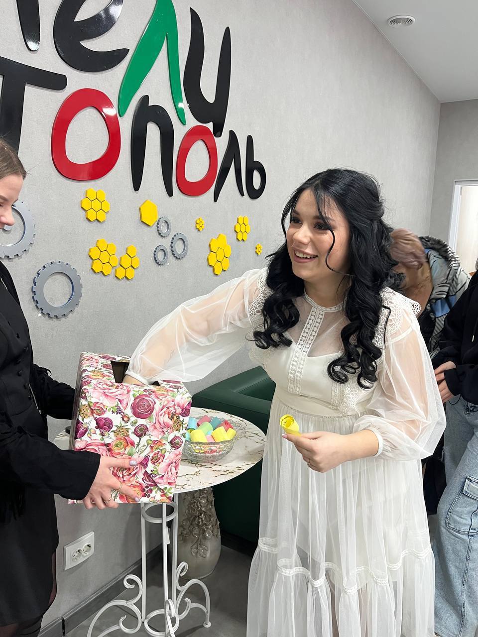 Наши прекрасные посетительницы с интересом втягивались в игру. Но главный восторг ждал нас, когда в игру вступила невеста! Девушка, которая пришла в ЗАГС регистрировать брак, с азартом вытянула свиток, правильно ответила на каверзный вопрос и получила свой первый подарок к 8 Марта!
