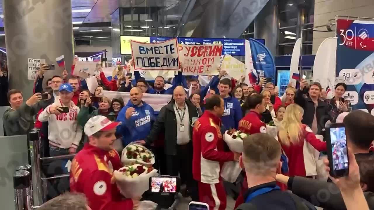 В аэропорту спортсменов встретили с цветами и плакатами, а болельщики выстроились в живой коридор, приветствуя команду словами поддержки.