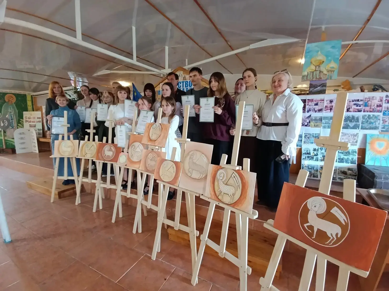 На протяжении всего мероприятия на мольбертах была представлена выставка готовых икон — работ иконописцев монастыря. Эти образцы высокого церковного искусства стали наглядным пособием и источником вдохновения для всех присутствующих.
