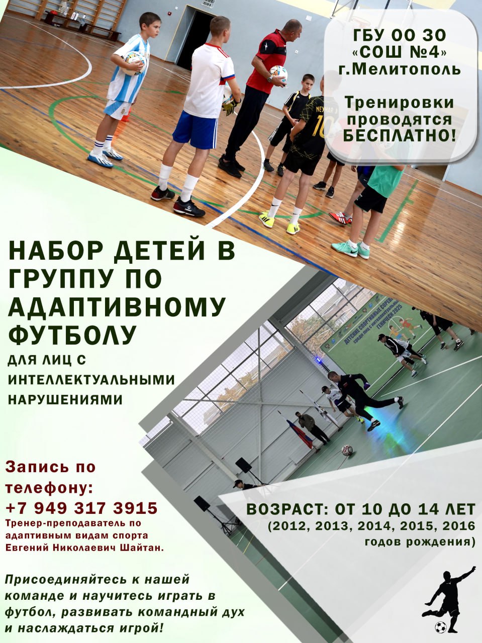 На базе ГБУ ОО ЗО «СОШ №4» г.Мелитополь продолжается набор детей в группу начальной подготовки по адаптивному футболу для лиц с ЛИН (легкими интеллектуальными нарушениями)! Это уникальная возможность для ваших детей развивать физическую активность, улучшать координацию и социализироваться в дружелюбной атмосфере!